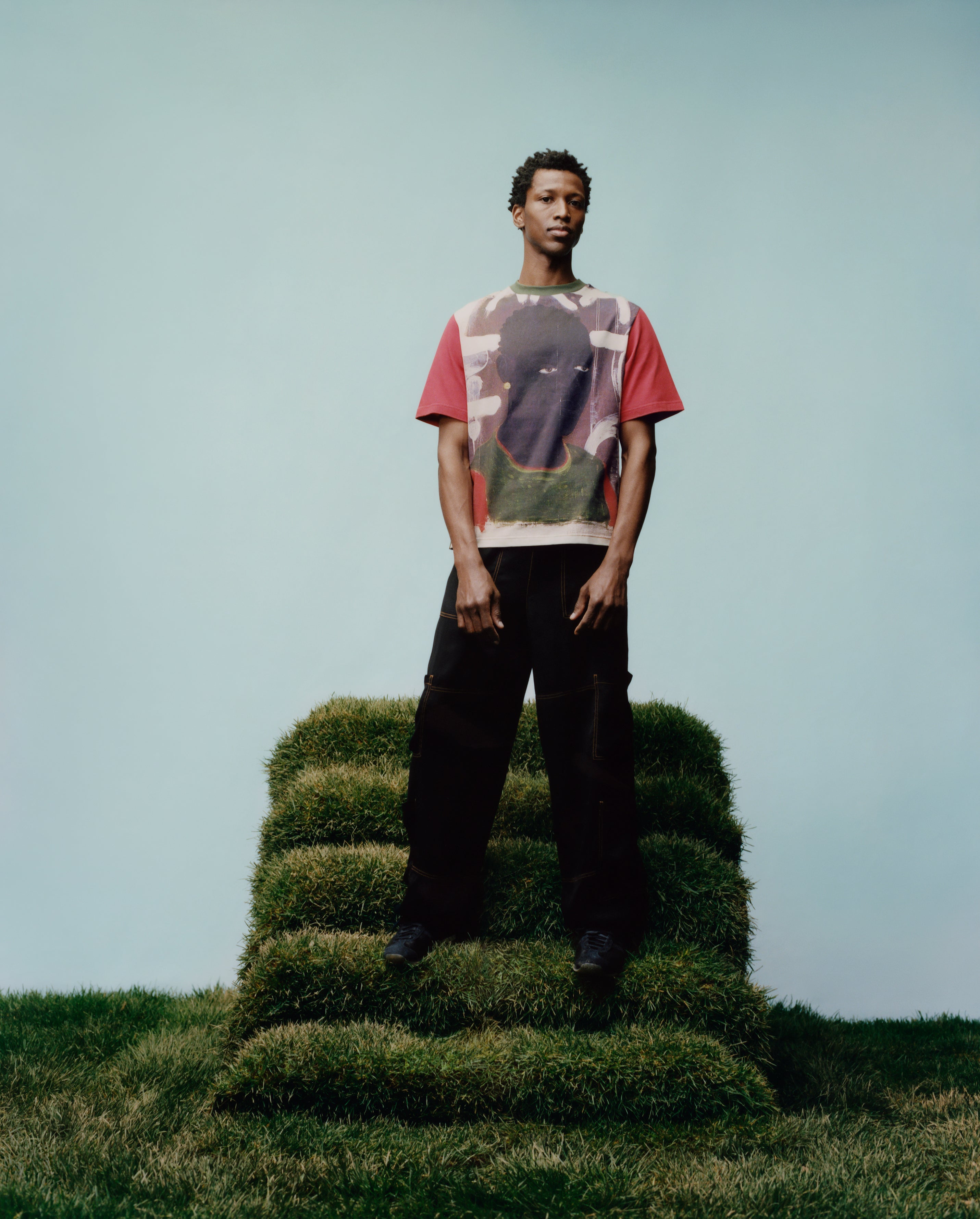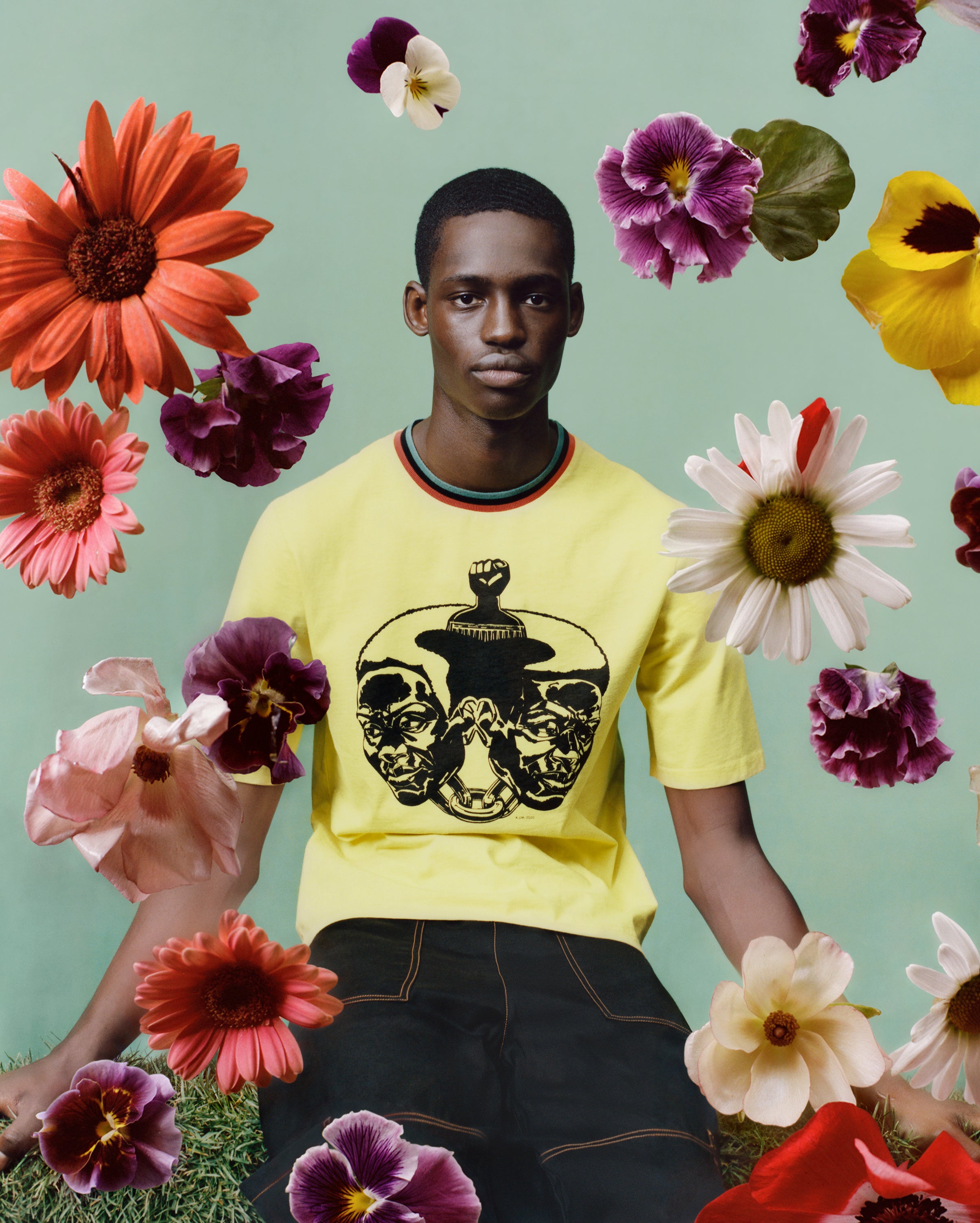 I am deeply grateful to Kerry James Marshall for his generosity in creating an original image for Wales Bonner, an emblem that radiates strength, unity and hope. I also wish to offer him my thanks for giving his blessing to reproduce a detail from Lost Boys: AKA Black Sonny (1993), a painting from the Lost Boys series, a body of work I hold dear. These paintings illuminate the poignant reality of lives lost, honouring them with presence and dignity. I hope that all who invest in these special T-Shirts will revere and cherish these images as I do, and share in my happiness that proceeds from the collection will be directed towards the essential goals of freedom and justice.”