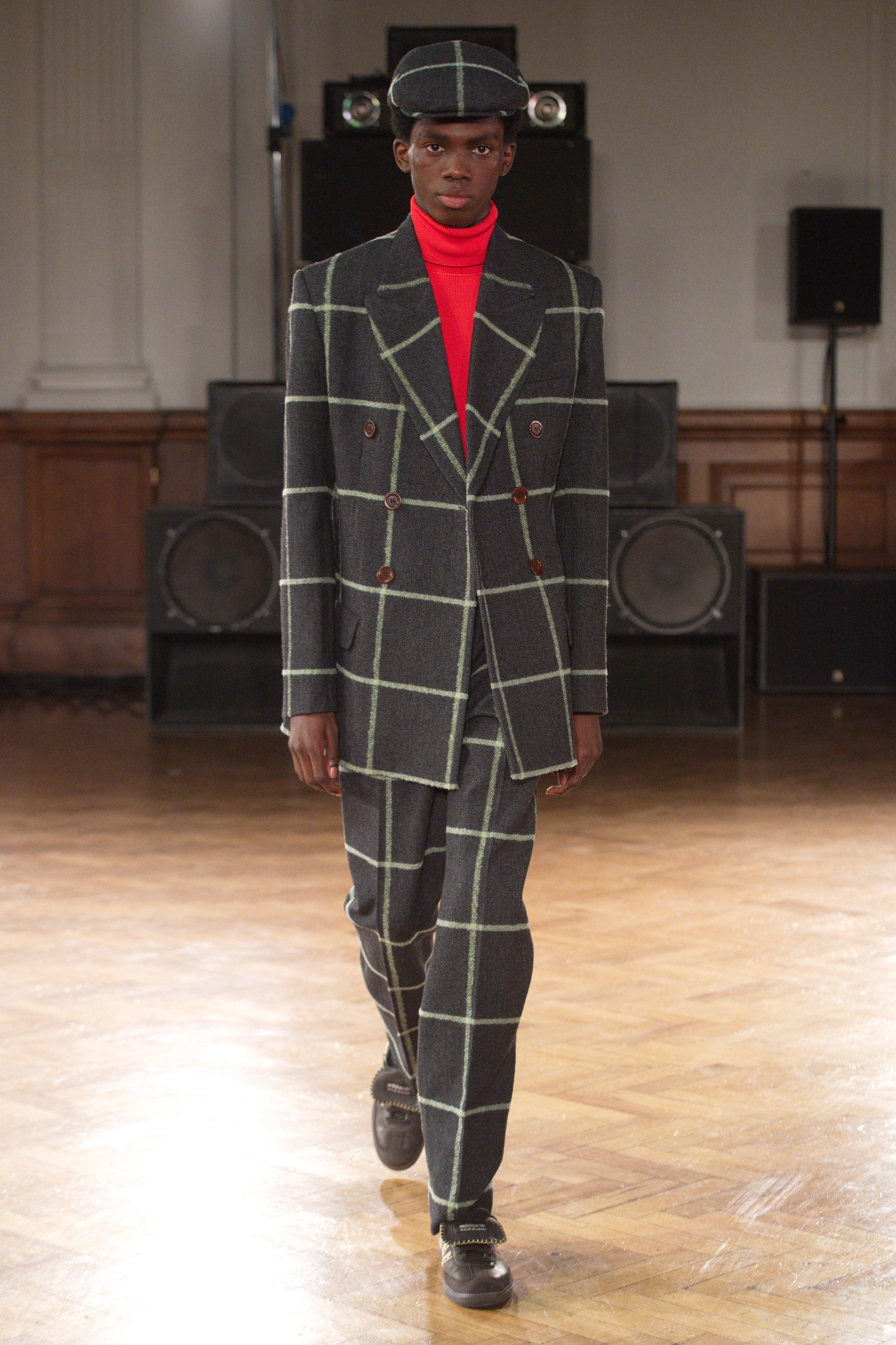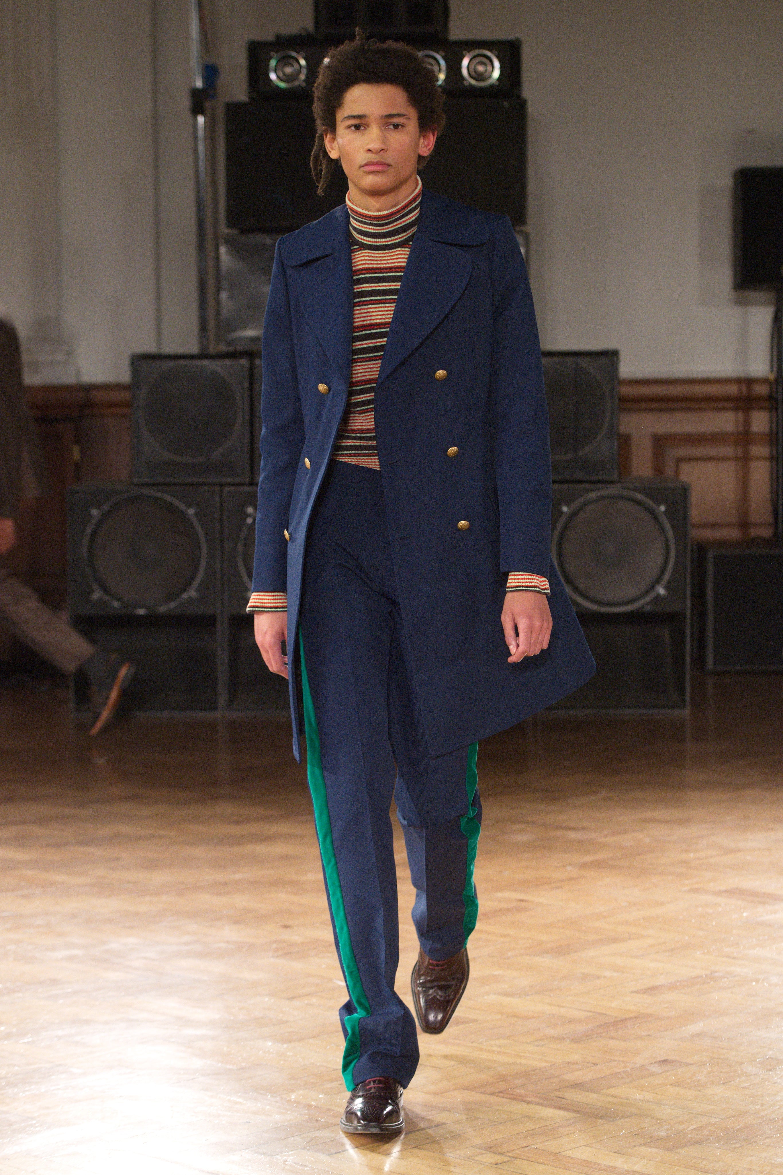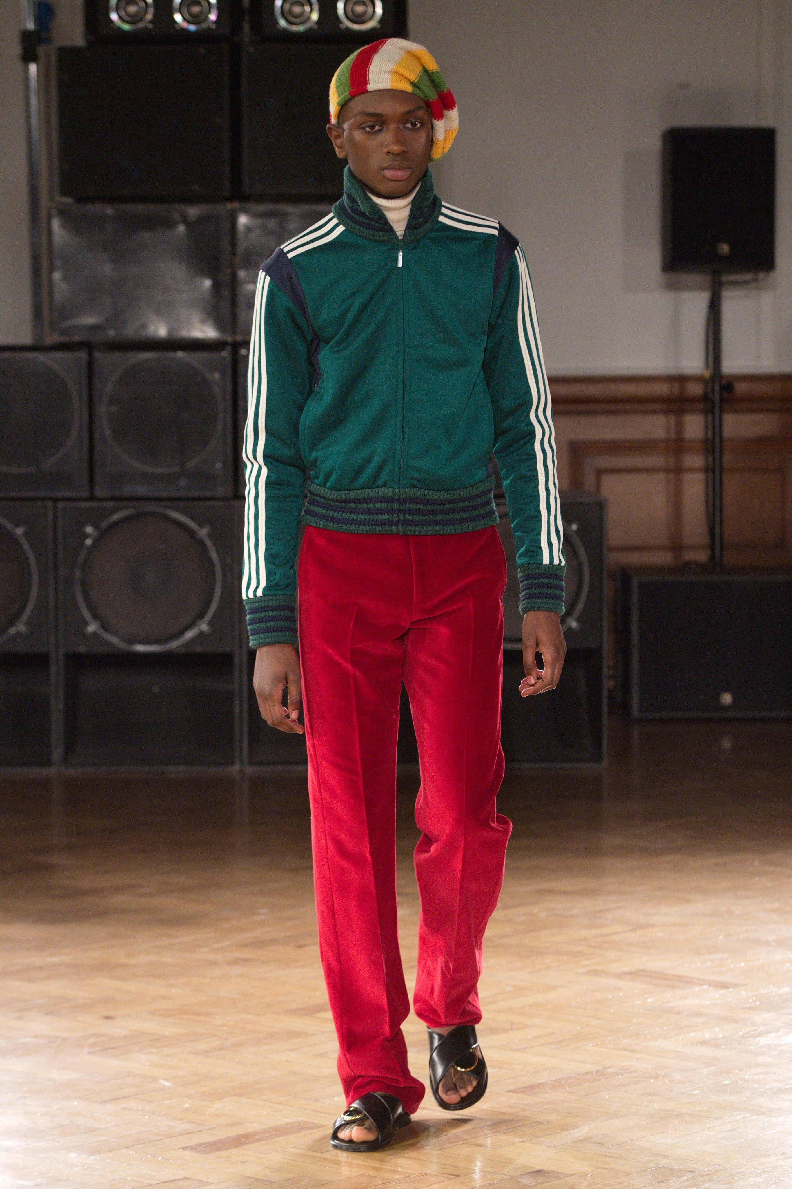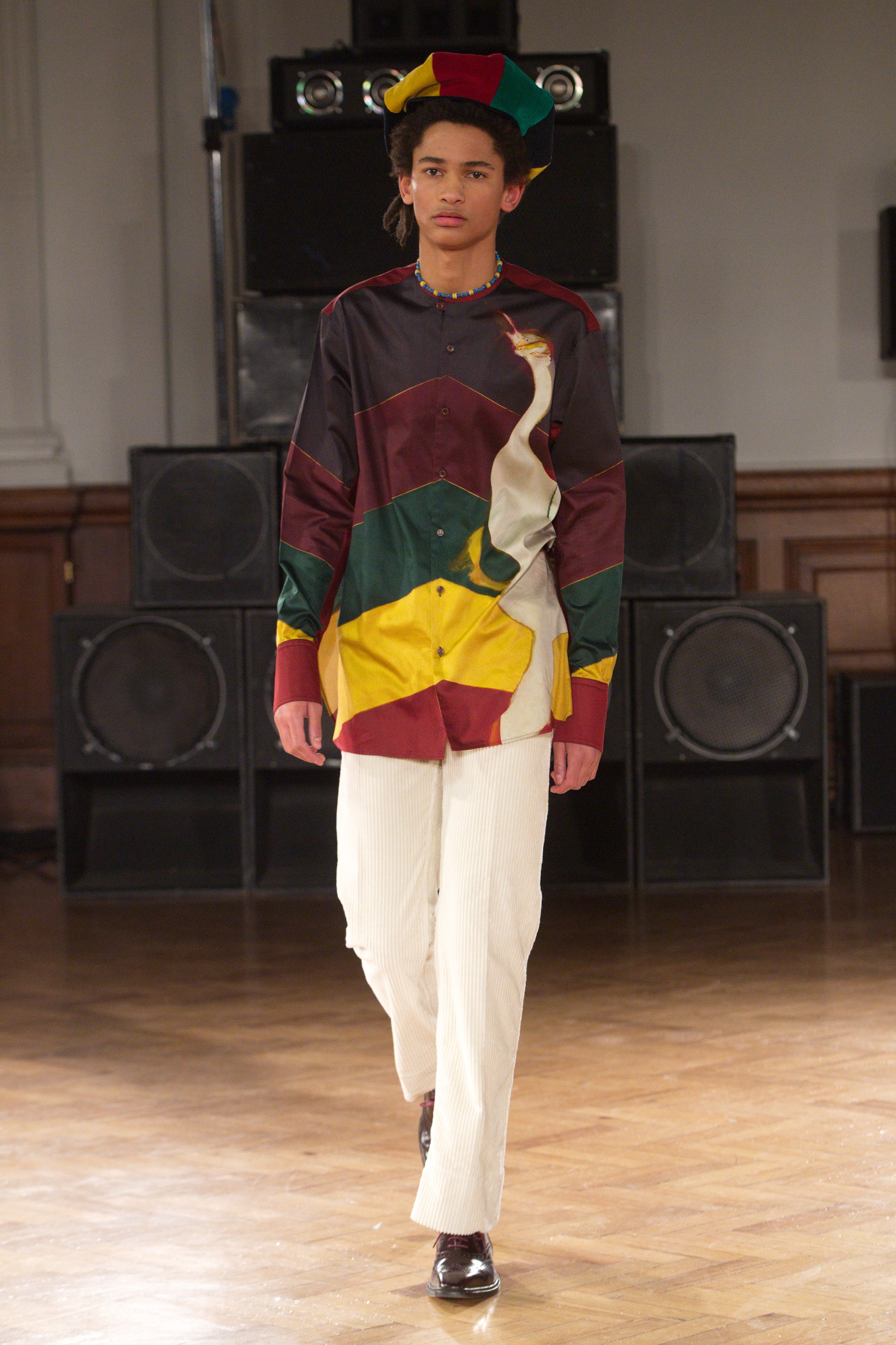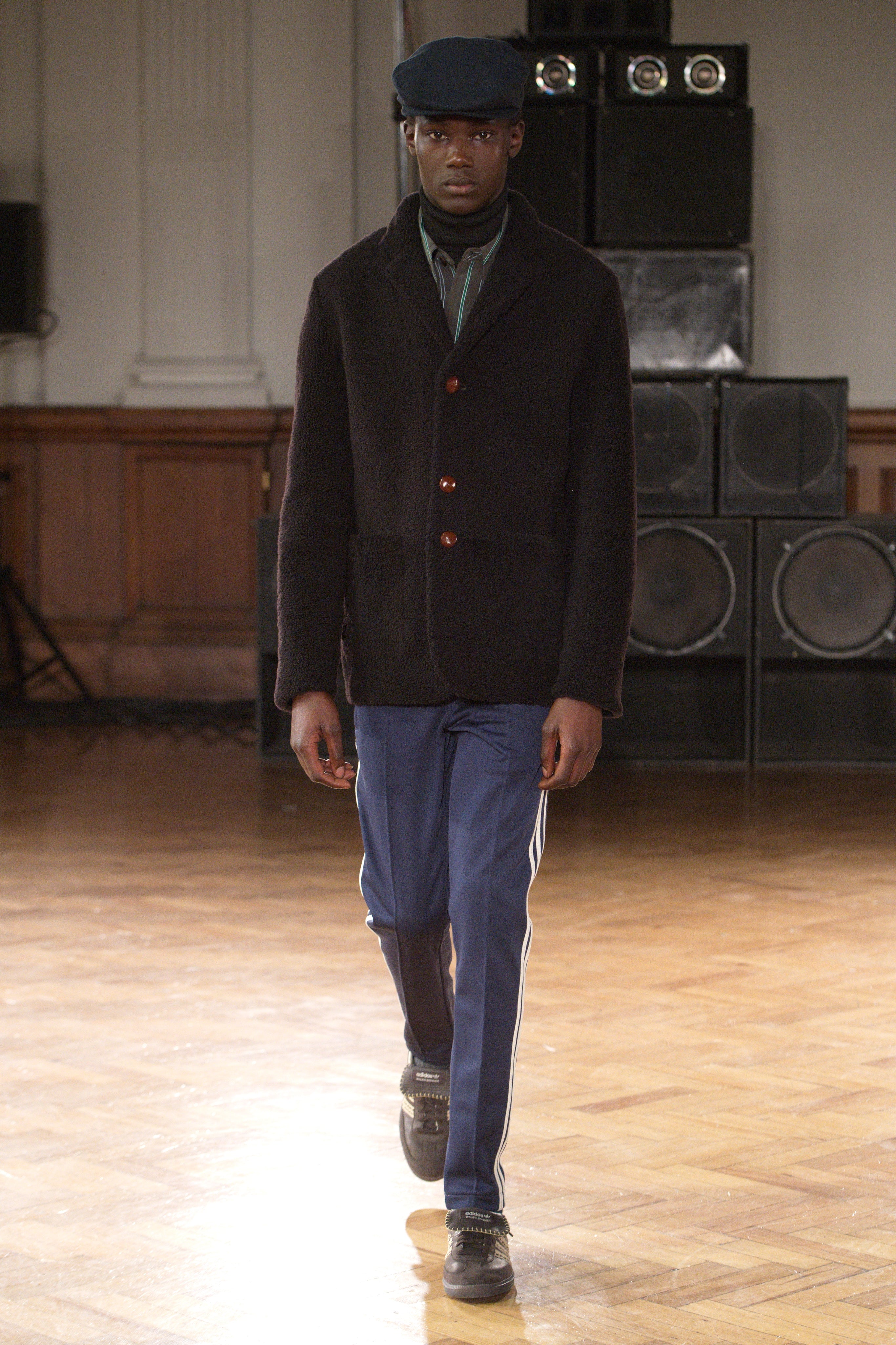 Gatherings in rented flats bond this community, transporting them through music and nightlife. Adidas freizeit in hues of crimson, ochre and emerald green. Connections to the Caribbean worn as emblems. Mod jackets in two-tone tweeds and windowpane check playfully mixed with archival crocheted sportswear silhouettes. Military influences are present in a tobacco gabardine cadet jacket and a navy twill pea coat fastened with Jamaican gold brass buttons. Rastafarian influences imbued in hand-knit beanies, crafted in raw Scottish shetland wool in collaboration with Stephen Jones. Swan I and II by British Guyanese abstract painter Frank Bowling are reinterpreted onto silk shirts, layers of warmth line soulful outerwear. The swans serve as a metaphor for the urge towards freedom.