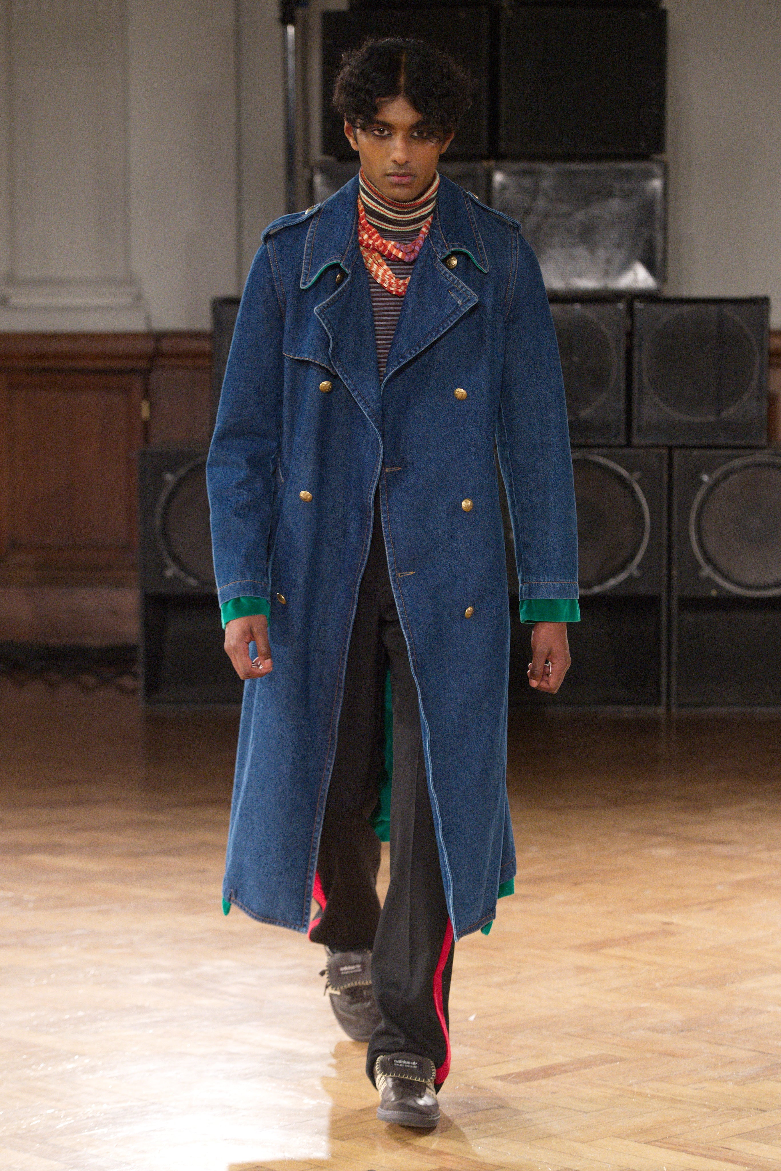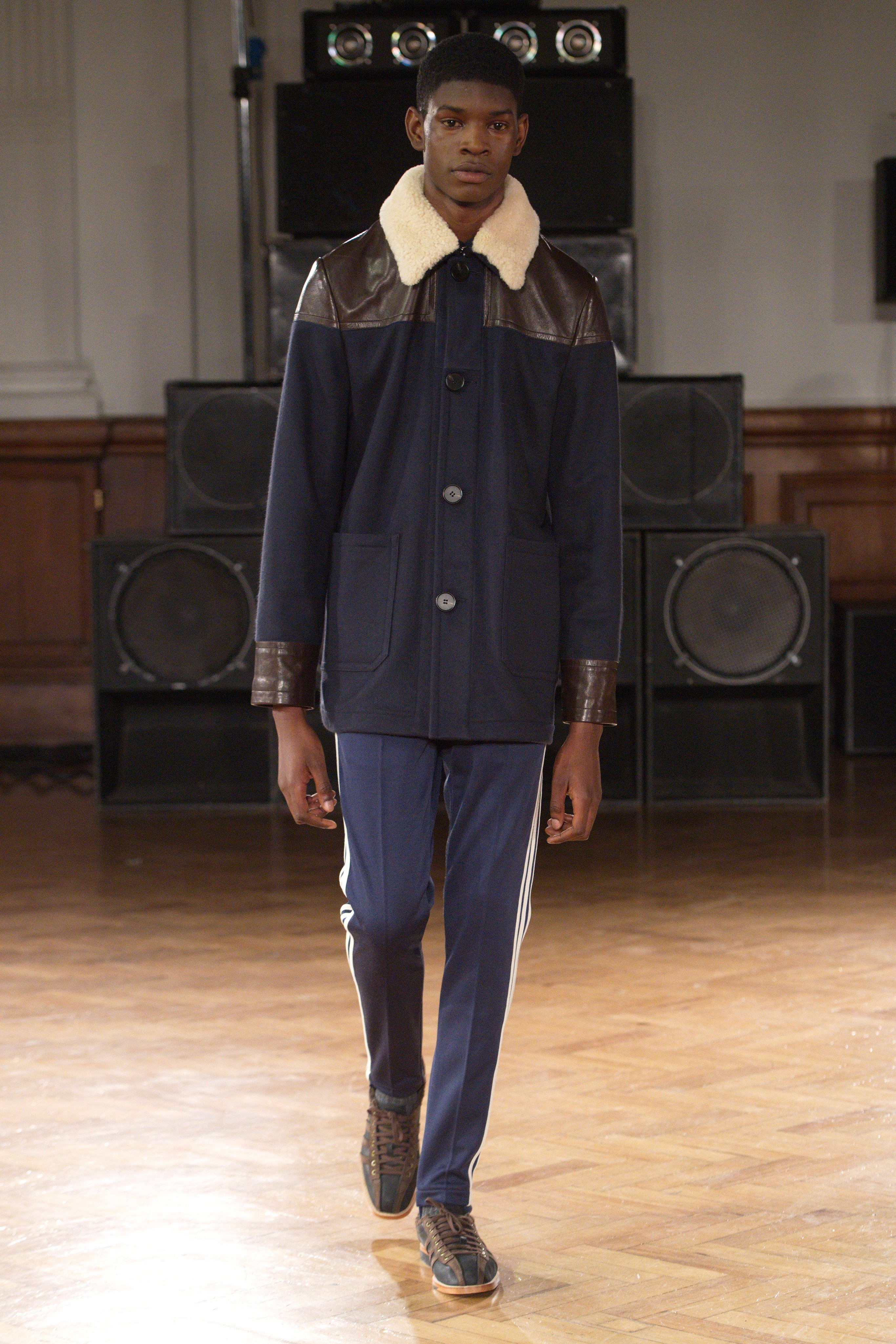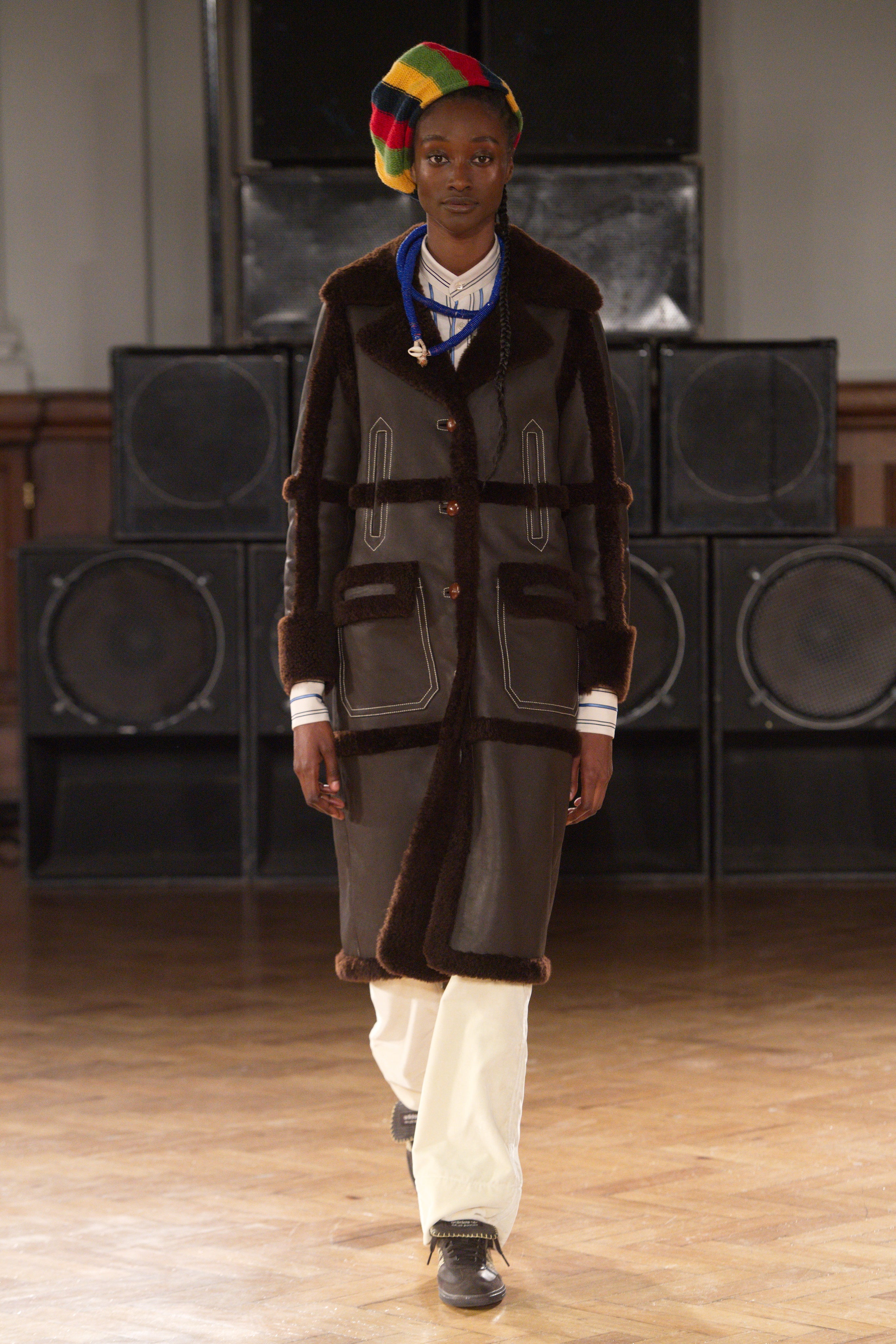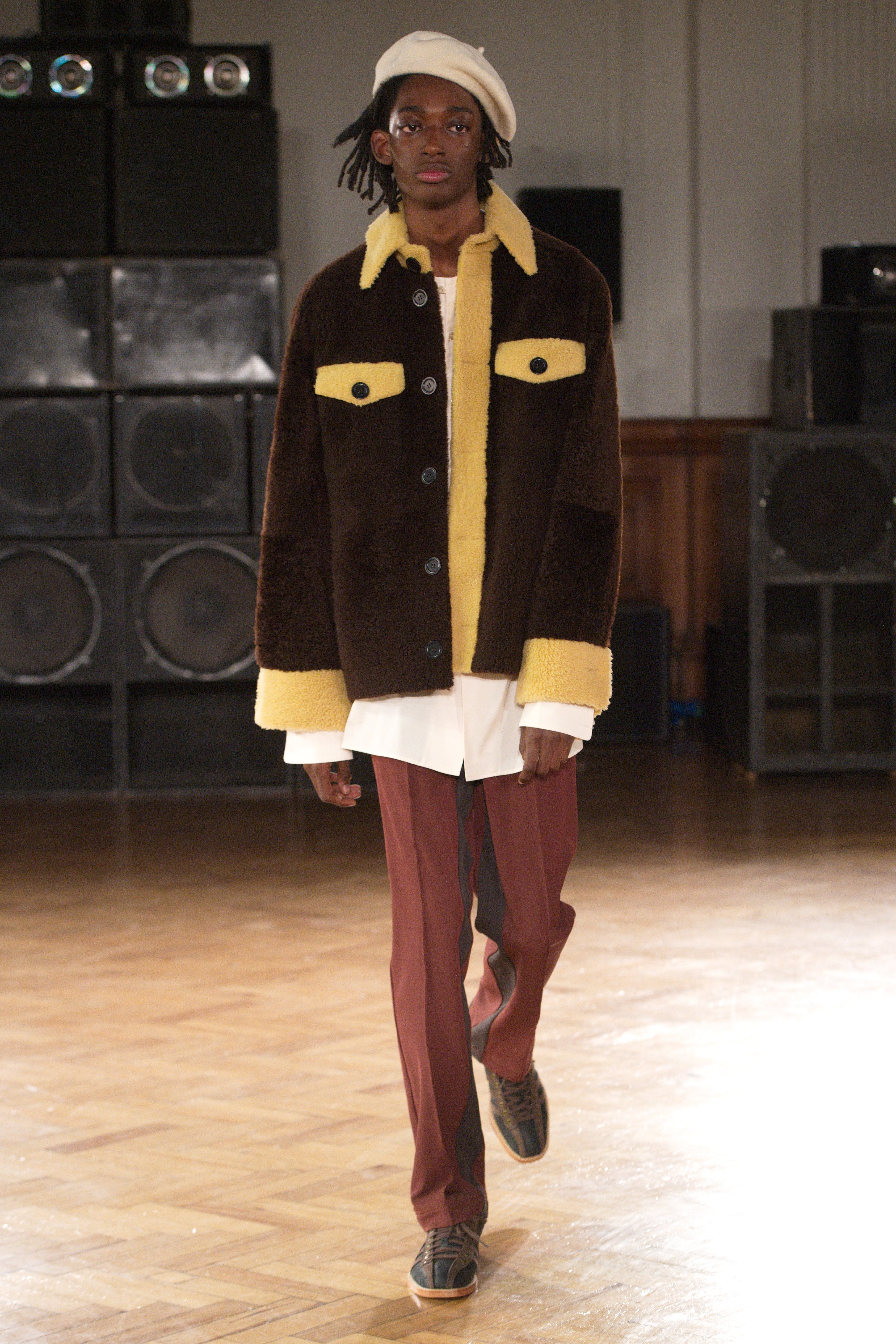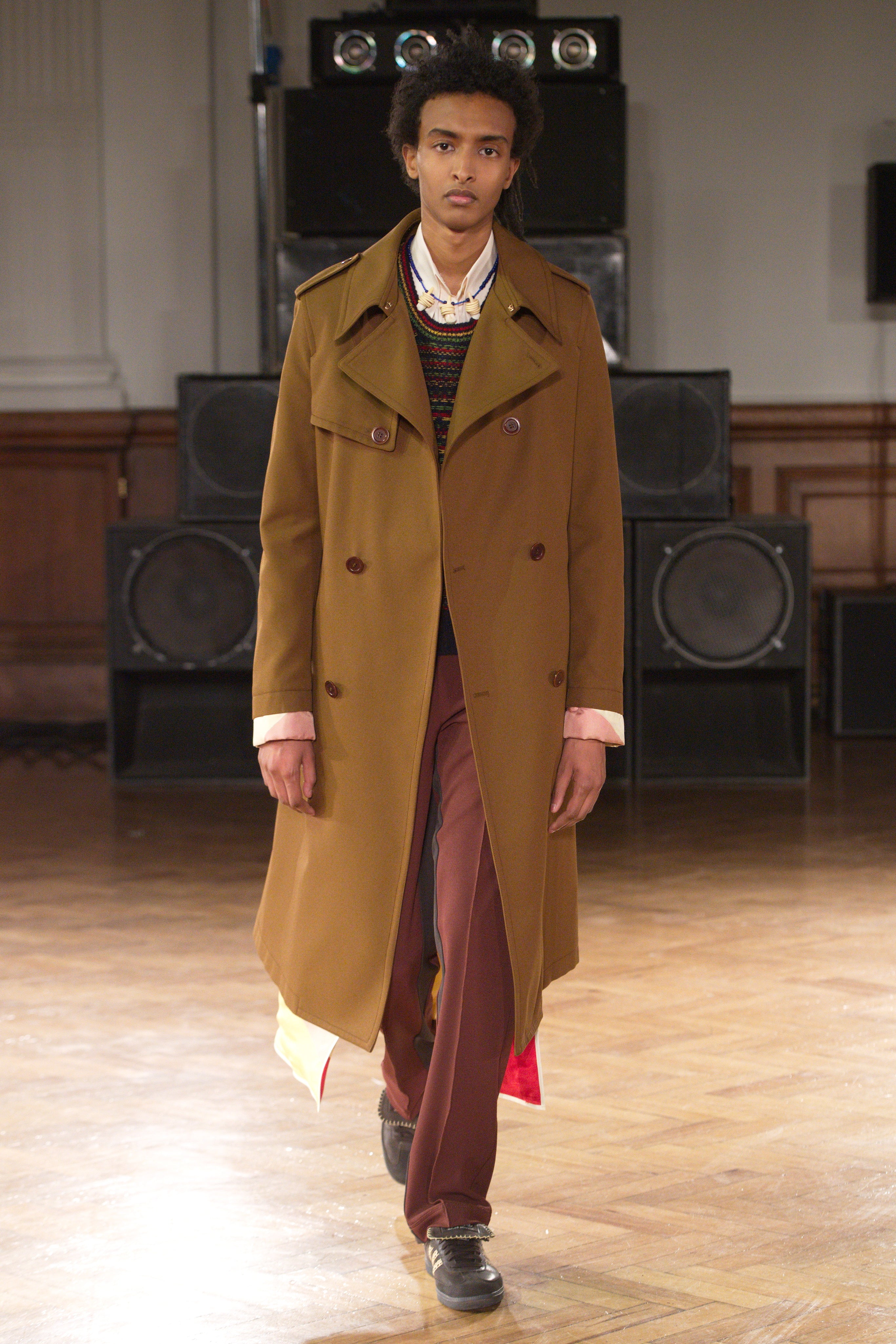 Gatherings in rented flats bond this community, transporting them through music and nightlife. Adidas freizeit in hues of crimson, ochre and emerald green. Connections to the Caribbean worn as emblems. Mod jackets in two-tone tweeds and windowpane check playfully mixed with archival crocheted sportswear silhouettes. Military influences are present in a tobacco gabardine cadet jacket and a navy twill pea coat fastened with Jamaican gold brass buttons. Rastafarian influences imbued in hand-knit beanies, crafted in raw Scottish shetland wool in collaboration with Stephen Jones. Swan I and II by British Guyanese abstract painter Frank Bowling are reinterpreted onto silk shirts, layers of warmth line soulful outerwear. The swans serve as a metaphor for the urge towards freedom.