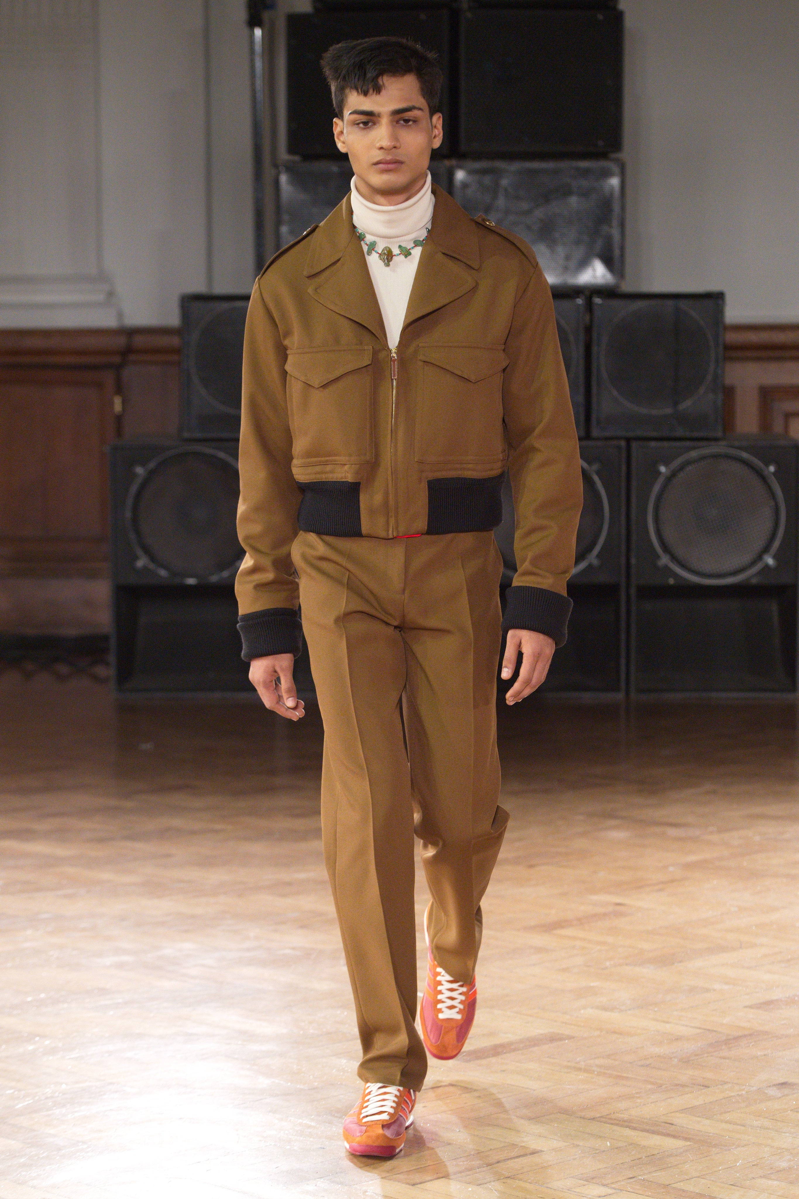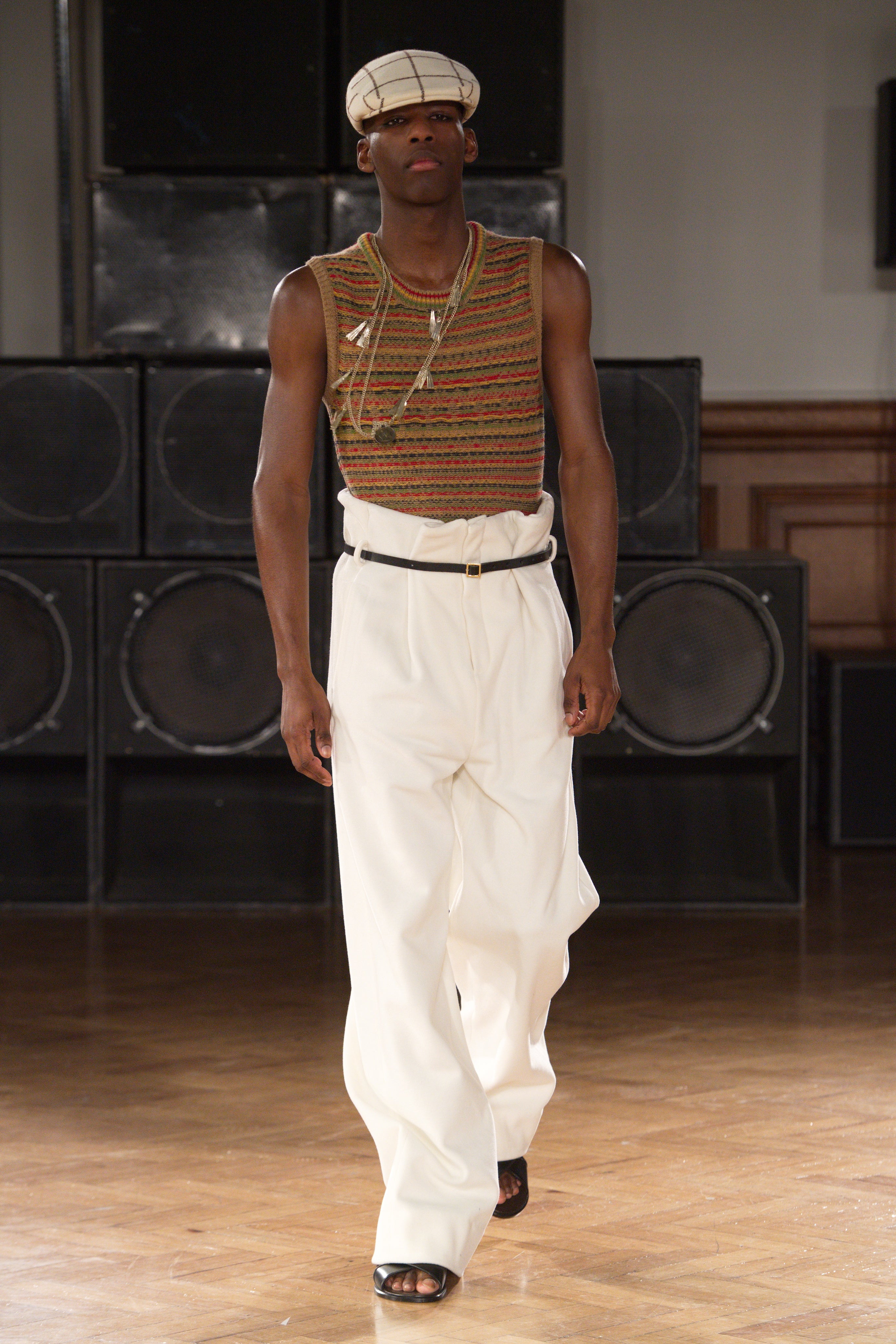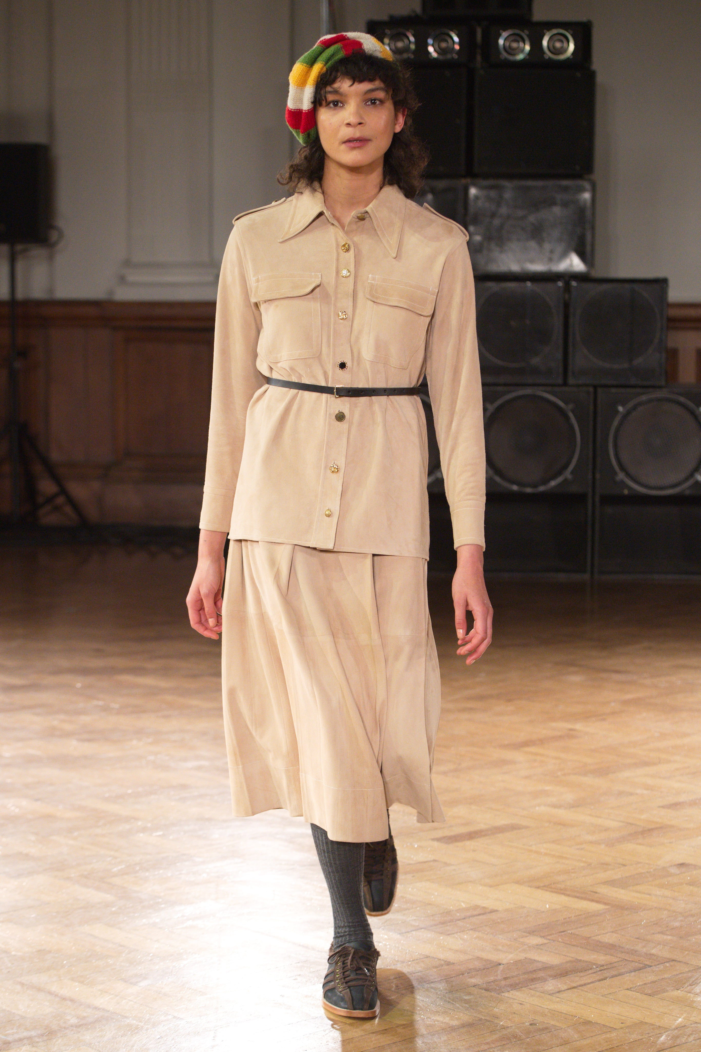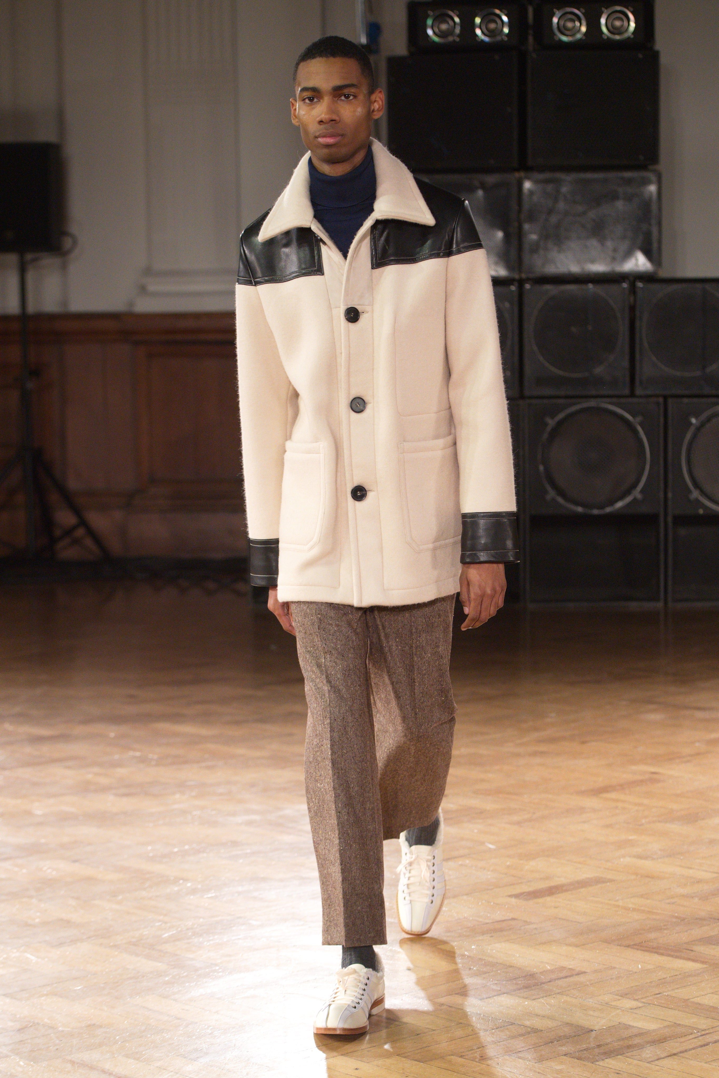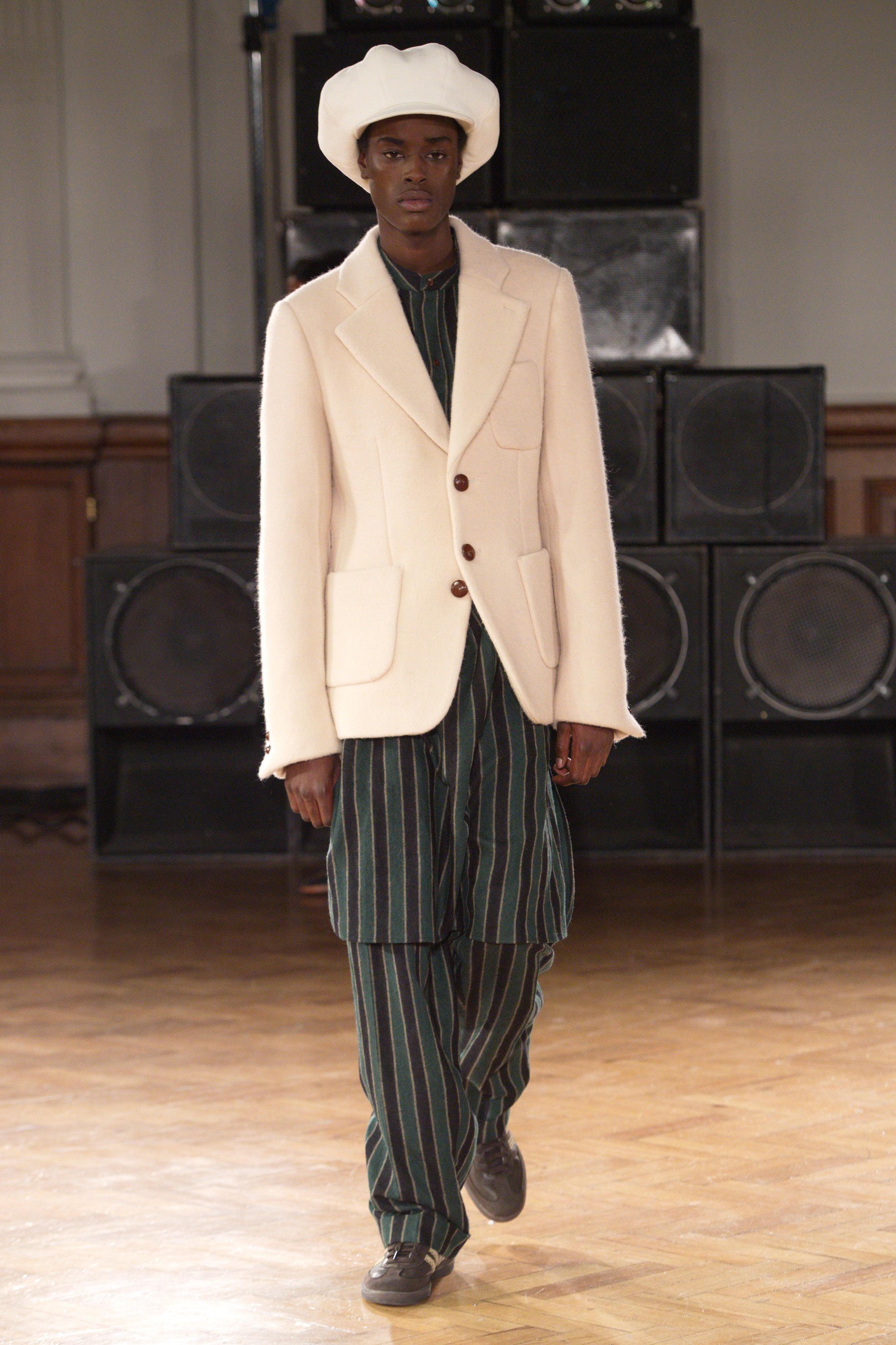 Gatherings in rented flats bond this community, transporting them through music and nightlife. Adidas freizeit in hues of crimson, ochre and emerald green. Connections to the Caribbean worn as emblems. Mod jackets in two-tone tweeds and windowpane check playfully mixed with archival crocheted sportswear silhouettes. Military influences are present in a tobacco gabardine cadet jacket and a navy twill pea coat fastened with Jamaican gold brass buttons. Rastafarian influences imbued in hand-knit beanies, crafted in raw Scottish shetland wool in collaboration with Stephen Jones. Swan I and II by British Guyanese abstract painter Frank Bowling are reinterpreted onto silk shirts, layers of warmth line soulful outerwear. The swans serve as a metaphor for the urge towards freedom.