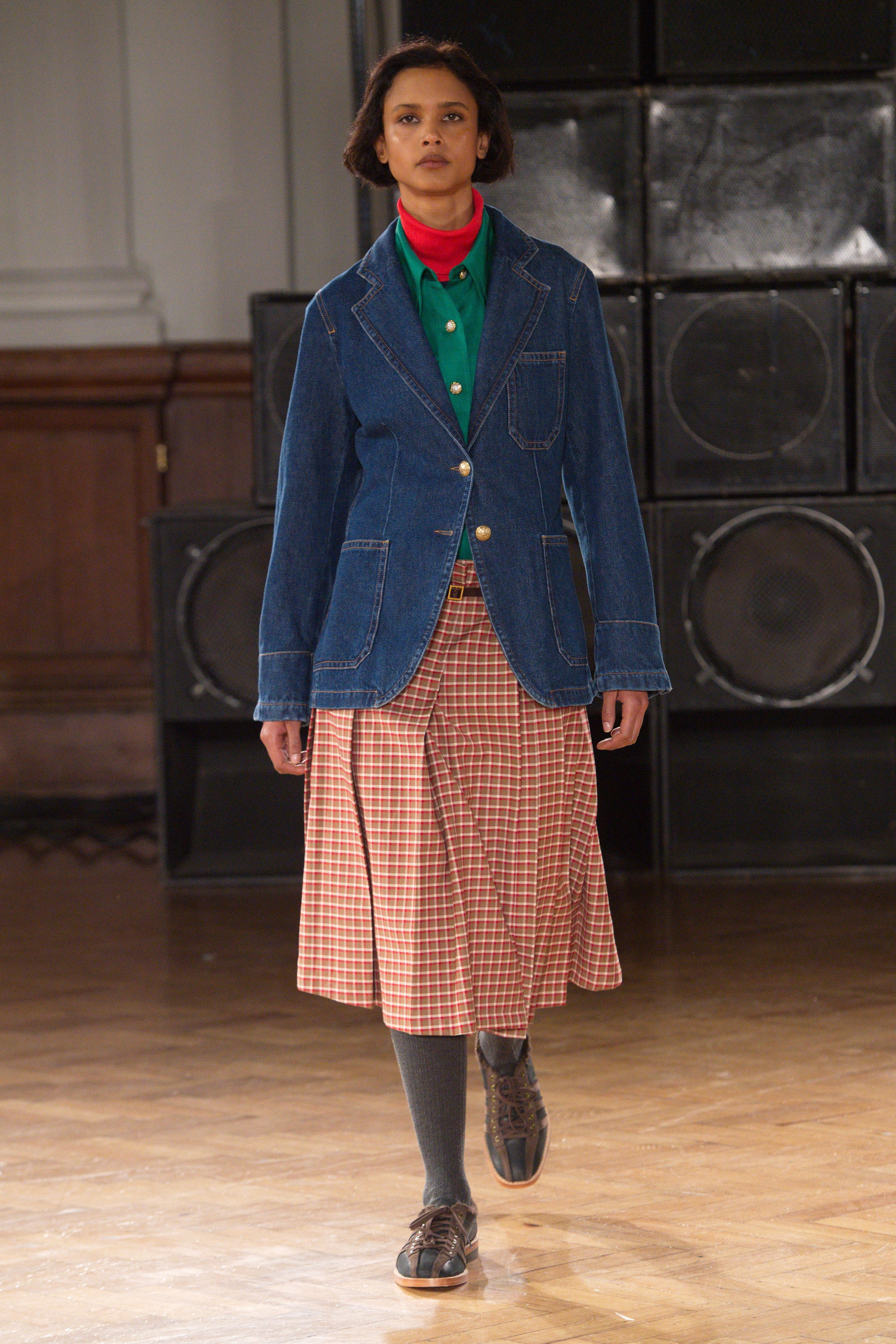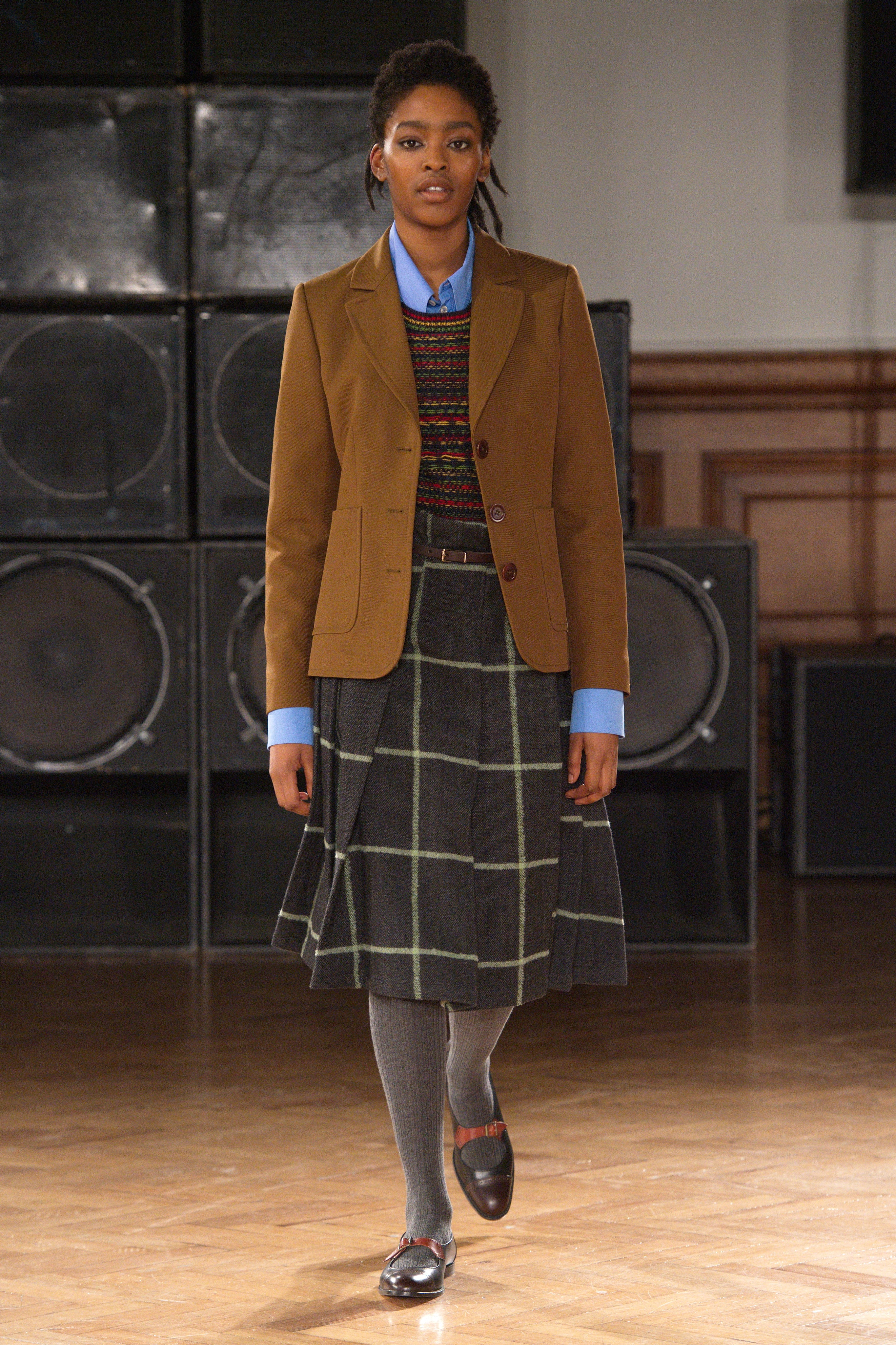 A lively community, confident and distinctive in their dress, irreverently sampling tropes of the British wardrobe: Donkey jackets, repurposed 1960s Saville Row tailoring. A moleskin double-breasted blazer adorned with found buttons. Mary-Jane’s by Manolo Blahnik.
