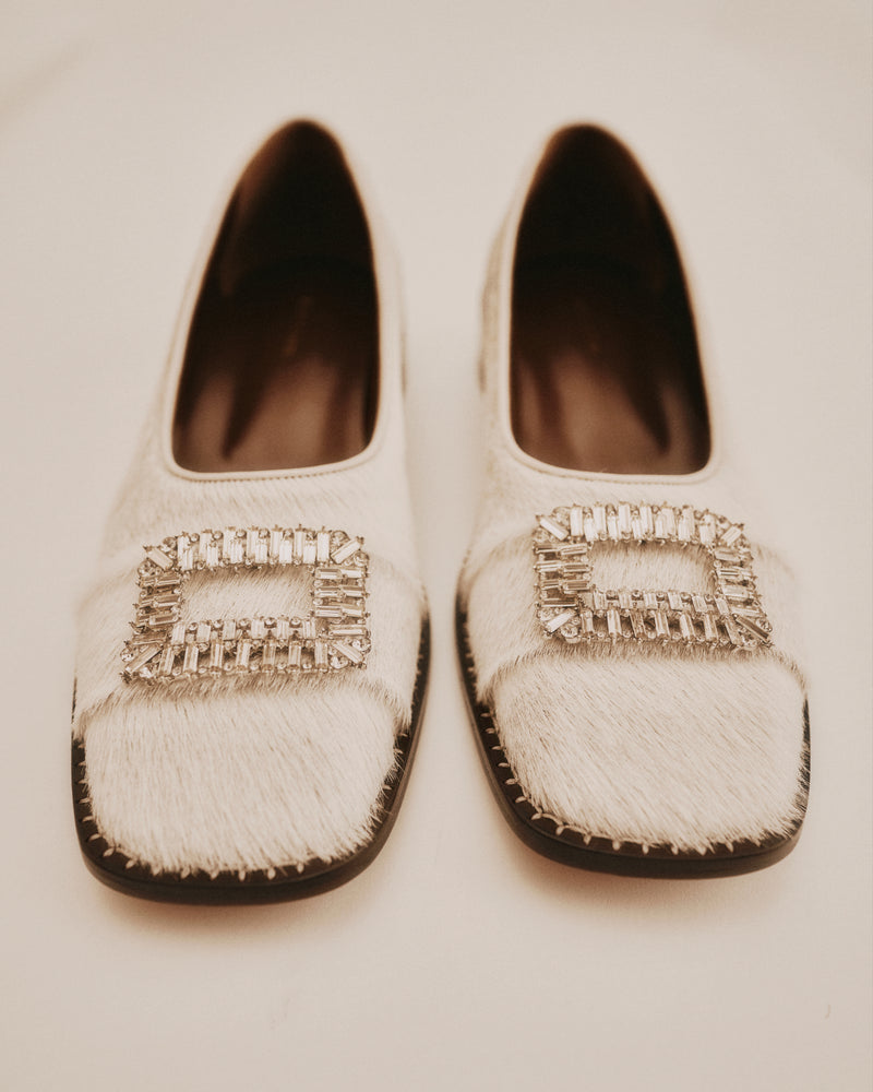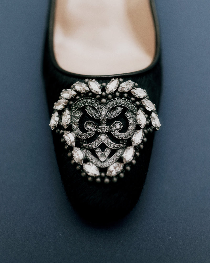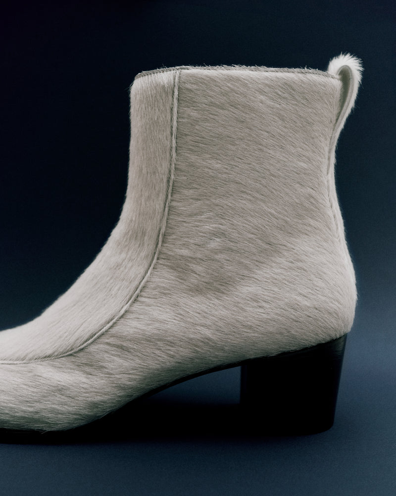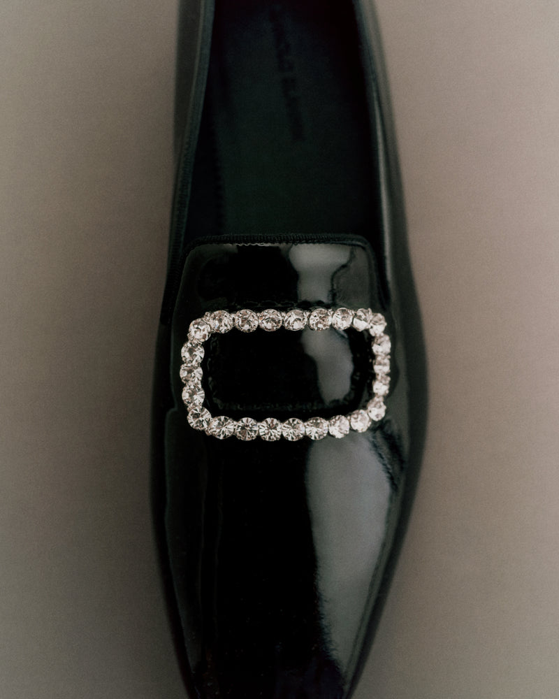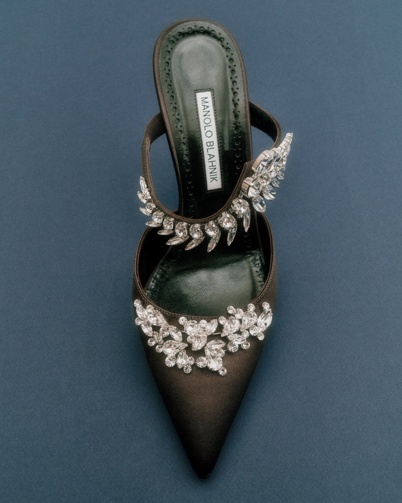 Opera boots, shoes and heels in patent leather, pony hair, and satin worn for each bespoke look continue the years-long collaboration between Wales Bonner and Manolo Blahnik.