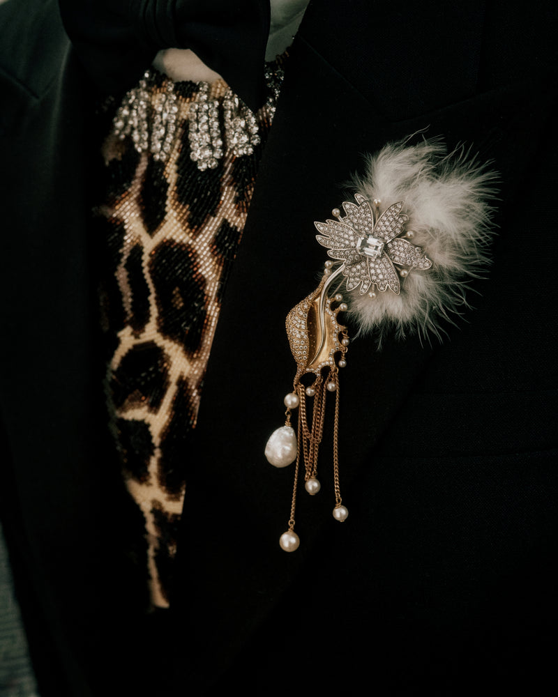 Delicate crystal embroideries on FKA Twigs' organza dress, as well as Omar Apollo's vest, were produced in partnership with Swarovski.