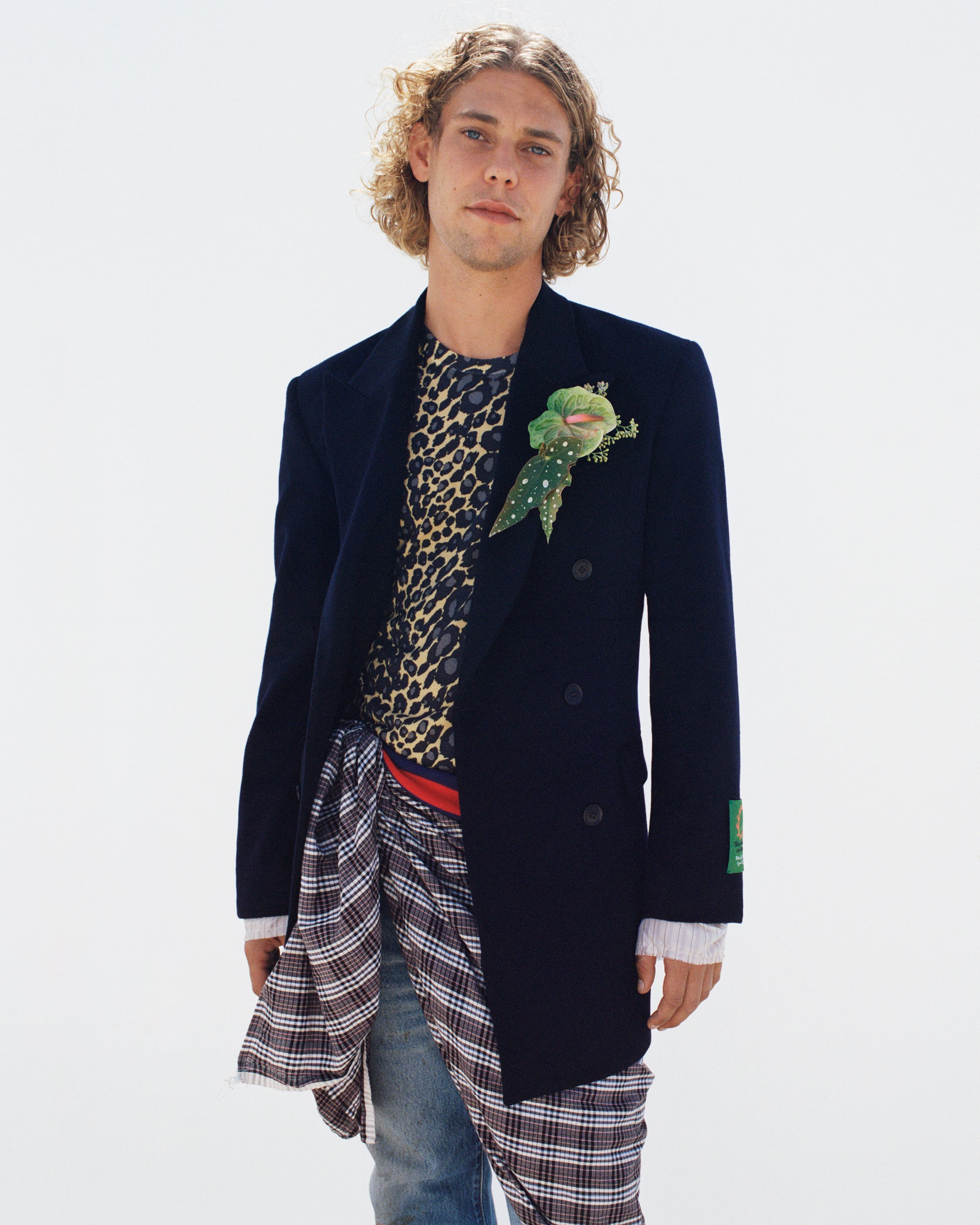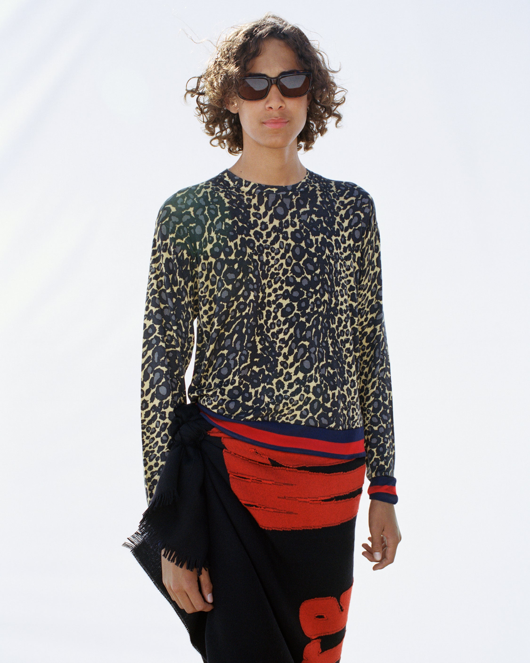 Fringed-hem shorts, studded stonewash denim and leopard-printed jumpers accompany a double breasted blazer crafted from navy Loro Piana doeskin wool. Wales Bonner codes are reflected in a bark brown leather varsity blouson and silk polo, printed with an image from Accra-based photographer Nana Yaw Oduro. The classic surf wardrobe is refined in a double-zip neoprene hoodie, logo-embroidered board shorts, and a beach sarong designed in collaboration with Peter Miles.